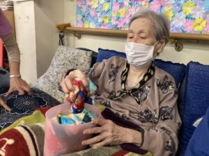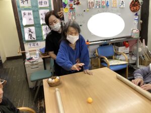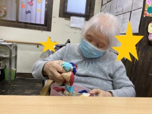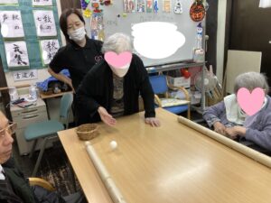ゲームはお手玉のつかみ取り大会!指先に力を込めて真剣勝負です。